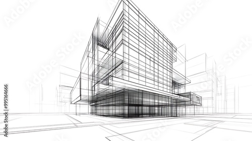 A black and white sketch of a modern building with a grid pattern on the facade.