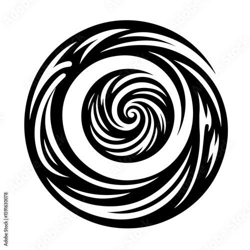 A black and white spiral vortex creates a sense of dynamic motion and hypnotic energy