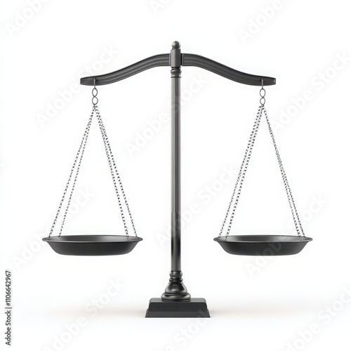 A black cast iron balance scale symbolizing justice, equality, and fairness isolated on a clean white background, perfect for legal concepts and themes related to law.
