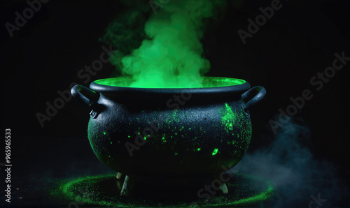 A black cauldron filled with green liquid and smoke sits against a dark background