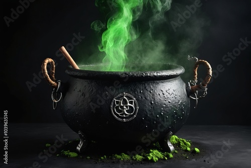A black cauldron with green fire underneath, isolated on a dark background, featuring elements of gold and magic, perfect for Halloween-themed illustrations