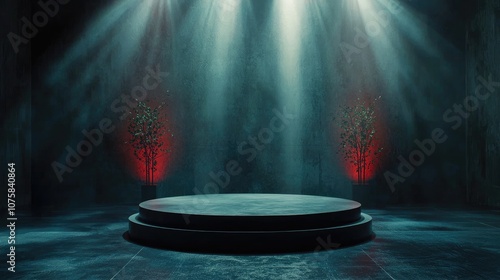 A Black Circular Platform with Red Lights and Plants in a Dark Room