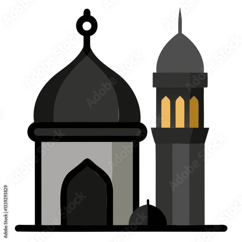 A Black dome silhouette over an old city minaret, blending Taj Mahal architecture with a caged religious vector