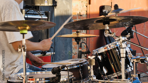 A black drum set, complete with drumsticks, cymbals, and microphones, is set up for a recording session or live performance, highlighting the various components of the kit.