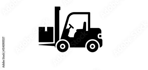 A black forklift truck lifting a box in a simple graphic design on a white background illustration