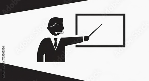 A black icon depicts a presenter using a pointer at a blank whiteboard, under a spotlight effect