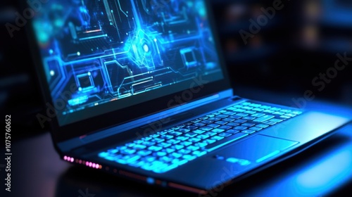 A black laptop with a blue backlit keyboard showing a futuristic sci-fi user interface with glowing lines.