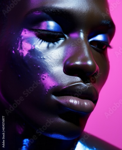 A black lgbt man poses with a daring mix of purple and blue make up, showcasing an empowered look of lip, eyelash, lipstick, and eyebrow toiletry