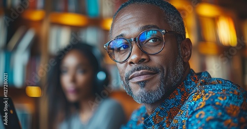 A black male consultant is using a computer for a video call, discussing online communication, and participating in a webinar at the office. He is chatting and having a discussion with an employee or