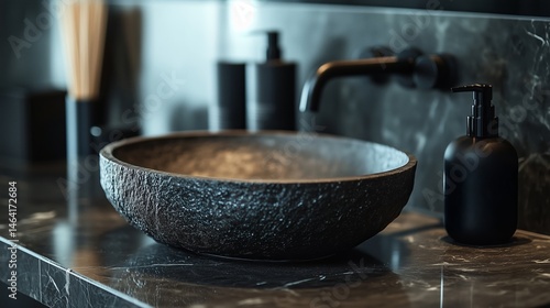 A black marble bathroom with a black textured sink and the beauty skin product. 18