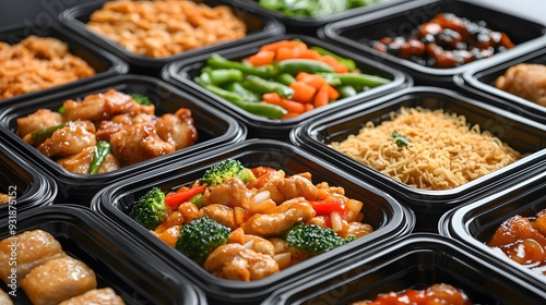 A black plastic food container filled with chicken balls, rice, and vegetables is seen in the middle of an array of other healthy meal boxes