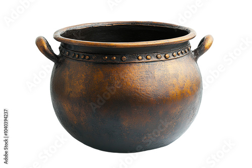 A black pot with a brown handle sits on a white background. on transparent background