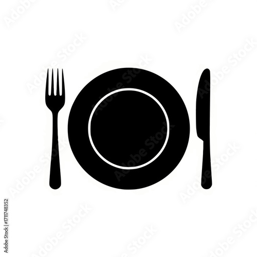 A black silhouette of a plate, fork, and knife, a vector graphic icon for food, dining, or restaurant use.