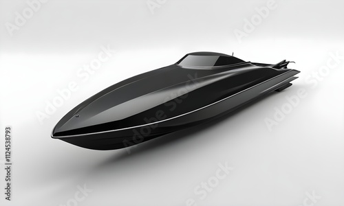 A black speedboat with a sleek, aerodynamic design and a pointed bow. The boat has a low profile and appears to be made of a durable material, possibly fiberglass or carbon fiber. The overall shape an