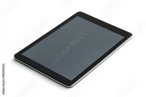 A black tablet with a gray screen is displayed on a white background in a studio setting