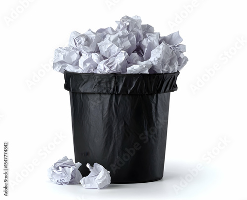 A black trash bin filled with crumpled paper showcasing waste and clutter in an office or home environment.