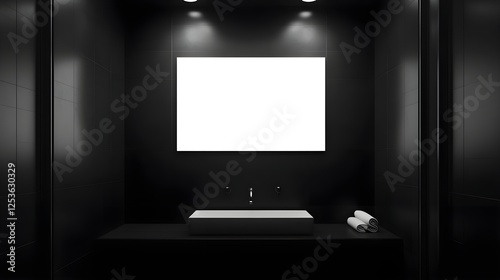 A black-and-white modern bathroom with sleek surfaces and a centered blank white frame.