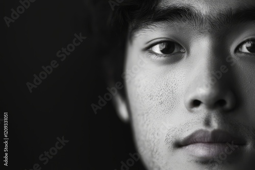 A black-and-white portrait of a young Asian man with a thoughtful expression, Generative AI