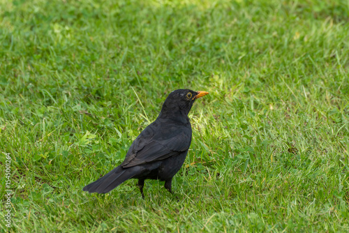 A blackbird with a bright beak gazes attentively to the side. It stands on a fresh green meadow.