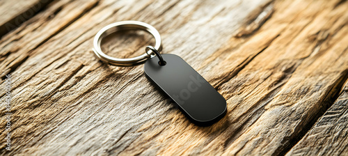 A blank black soft-touch keychain placed on a wooden surface. The side is empty for branding. Elegant, premium, stylish.