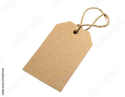 A blank brown kraft paper tag with angled corners and a twine string, isolated on a white background.