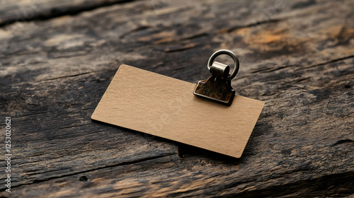 A blank brown paper tag clipped to a metal binder on a rustic wooden background, perfect for branding or labeling.