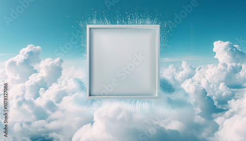 A blank canvas floating above fluffy clouds in a serene blue sky during daylight hours