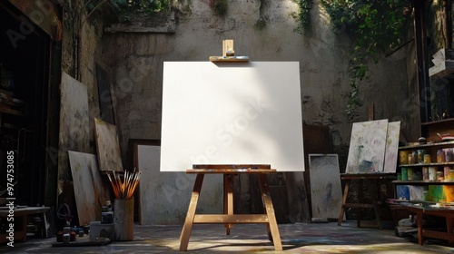 A blank canvas on an easel in an artist's studio, surrounded by art supplies and paintings.