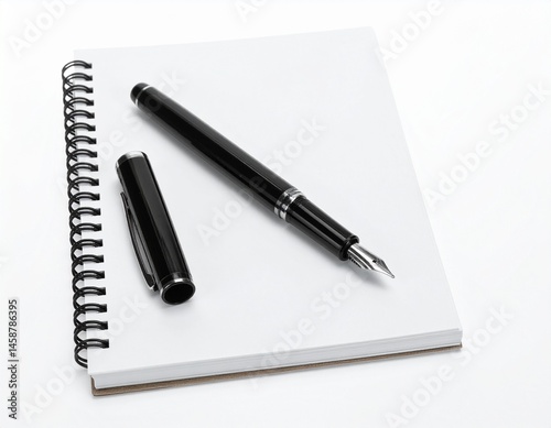A blank notebook and stylish pen are placed on a pure white surface, ready to capture thoughts and ideas. The shiny pen cap sits beside, poised