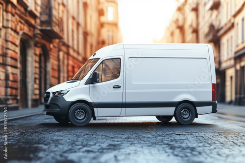 A blank phone screen juxtaposed with a delivery van navigating a rain-soaked urban street during twilight