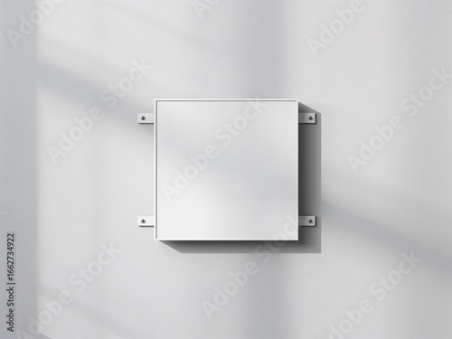 A blank square sign mounted on a white wall with natural light and shadows. A clean, minimalist mockup for a logo or sign.