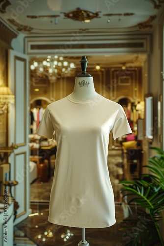 A blank t-shirt mockup on a mannequin in a stylish boutique with a neutral color palette and elegant decor.