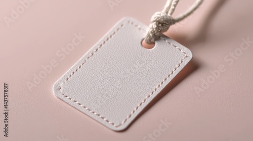 A blank white leather tag with a stitched border and string, lying on a soft pink surface.
