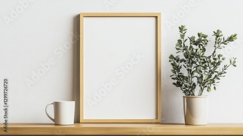 A blank wooden frame mockup on an oak console table, leaning against the wall in front of it, against a white background