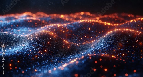 A blue and orange wave of light with many small dots