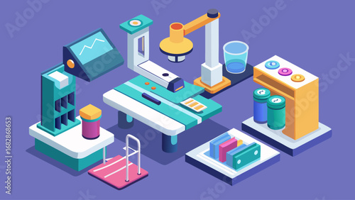 A blue and red background with a lab table with a microscope and other lab equipment. The lab table is filled with various items such as a box, a bottle, a cup, a vase, and a book