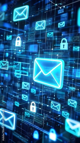 A blue and white image of a computer screen with many different icons, including an envelope and a lock