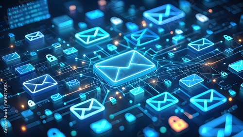 A blue and white image of a computer screen with many different icons, including an envelope and a lock
