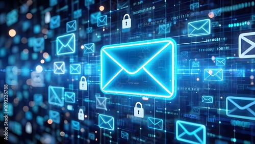 A blue and white image of a computer screen with many different icons, including an envelope and a lock