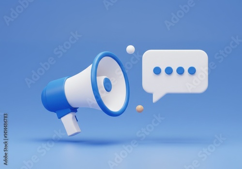 A blue and white megaphone with a speech bubble on a blue background in a minimalist style render