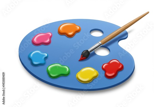 A blue artist palette with various colors of paint and a brush resting on the surface of the palette