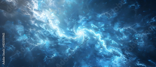 A blue background, glowing with light. a spinning spiral at right, The overall style is futuristic and technological, with an abstract white background and curved lines