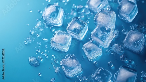 A blue background with a bunch of ice cubes on it. The ice cubes are scattered all over the background, some are closer to the foreground and others are further away illustration
