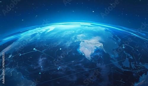 A blue background with digital lines connecting the world, representing a global network and connectivity.