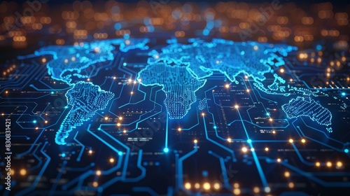 A blue circuit board, its intricate pathways resembling a digital world map, represents the global connections of technology