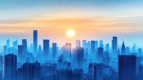 A blue cityscape skyline with a hazy sun rising behind the buildings.