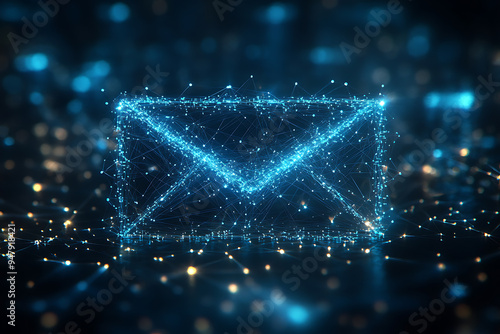 A blue envelope icon is positioned on a dark abstract background, representing email and online communication
