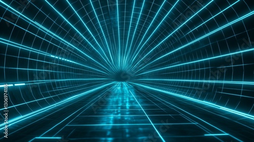 A blue grid background with glowing neon lines leading to the center of an empty tunnel, creating a futuristic and high-tech atmosphere for virtual reality or gaming themes