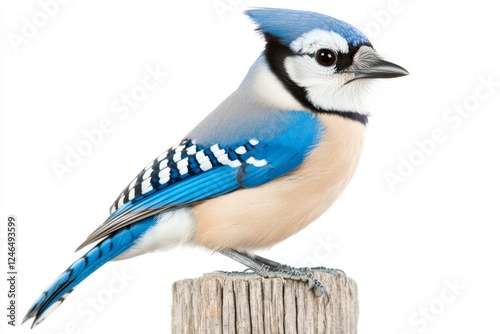 A blue jay with intricate patterns on its feathers, perched on a wooden fence with a natural background