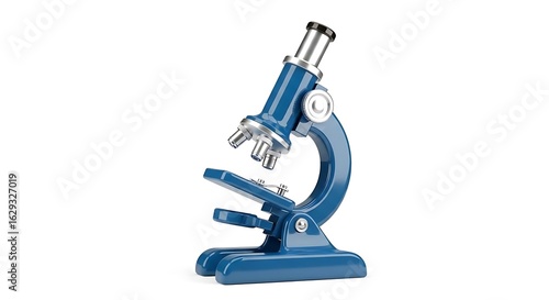 A blue microscope standing upright on a white background in a studio shot with good lighting
